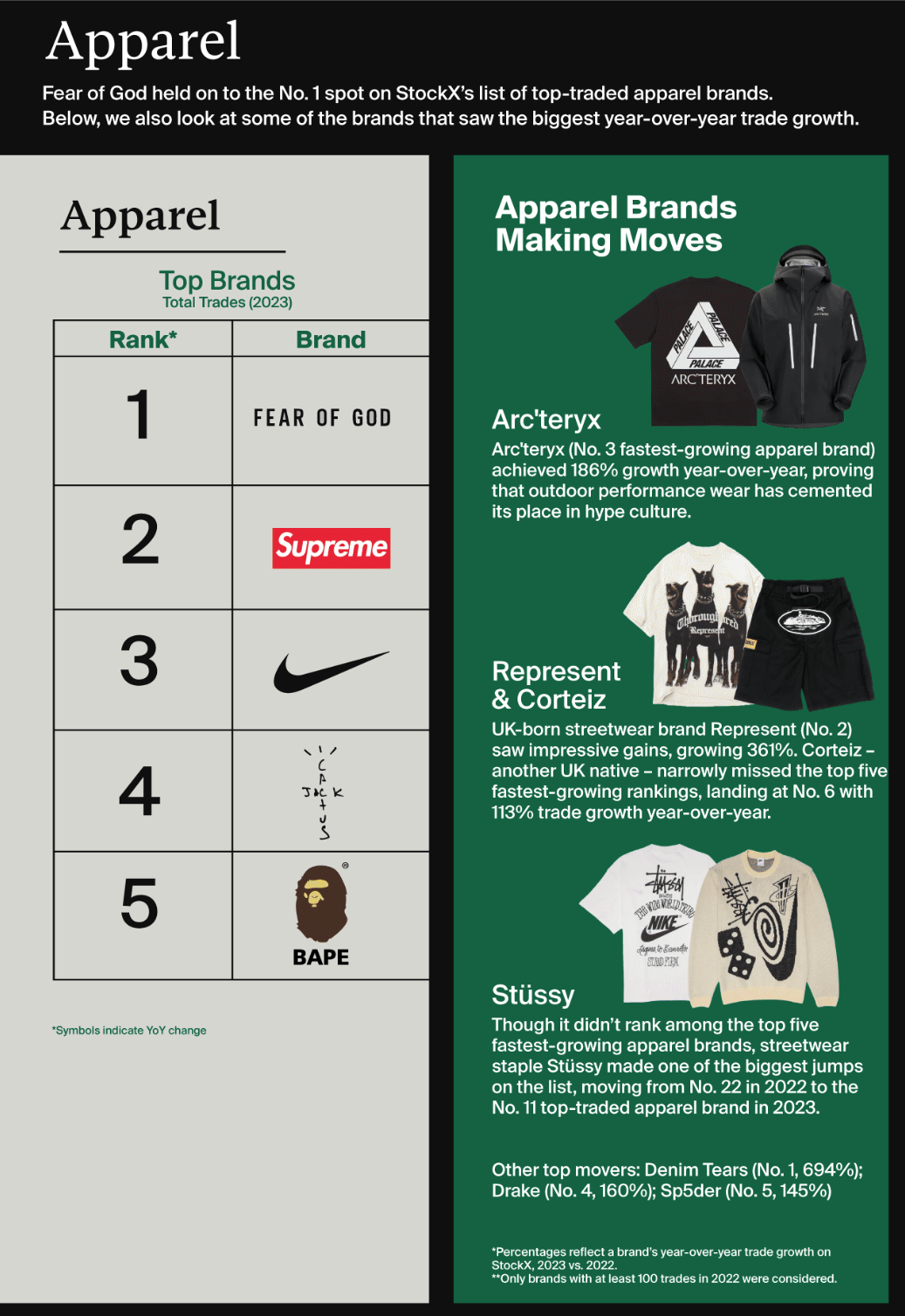 Согласно отчету StockX за 2024-2025 годы, Supreme сохраняет лидерство в некоторых категориях, но его доминирование ослабевает. Бренд больше не является номером один в категории одежды на StockX впервые в истории платформы, уступив позиции Fear of God Essentials и другим брендам. Однако интерес к аксессуарам и коллаборациям (например, брелоки-камеры) остается высоким, показывая, что коллекционная составляющая бренда жива.